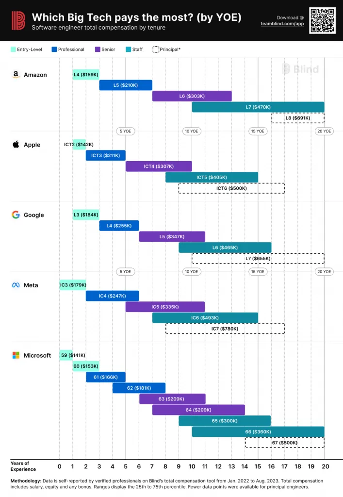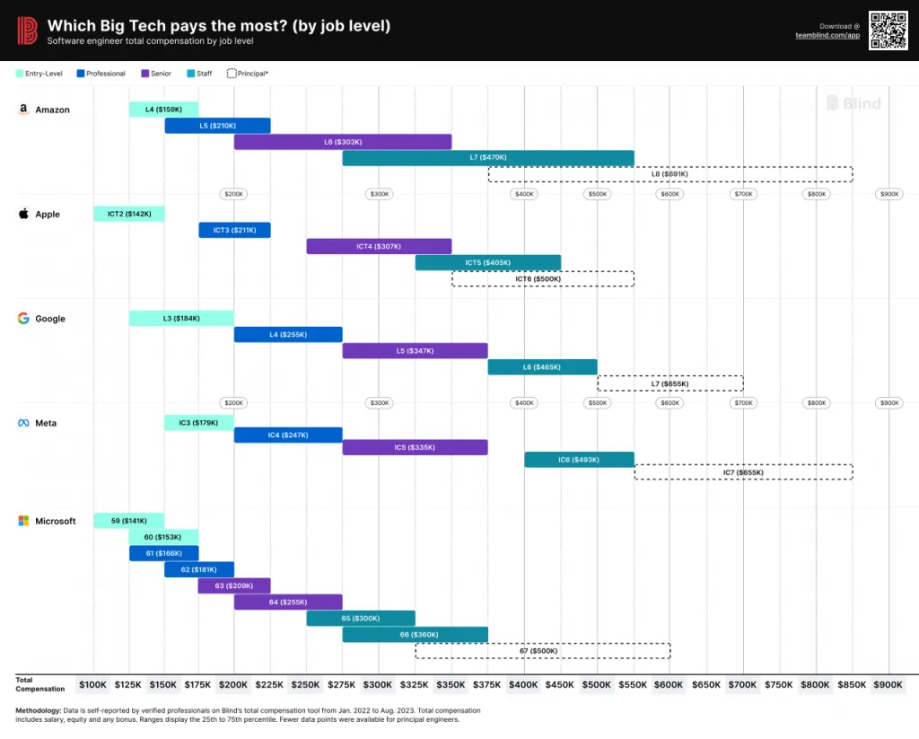 この傾向は、プロフェッショナル、シニア、スタッフ、プリンシパルなど、各職位レベルでほぼ一貫しています。しかし、Blindはデータから他にも興味深い点をいくつか発見しました。例えば、Amazonの給与レンジは他社よりも広く、「報酬は大きく変動する可能性がある」ということです。