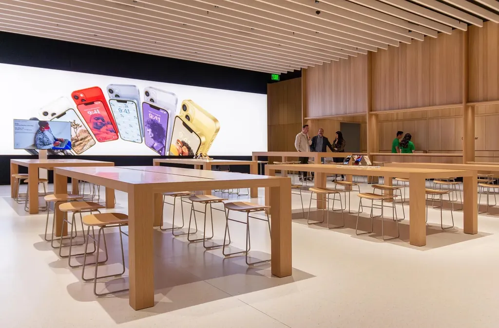 Appleは、ライトボックス天井の代わりに、音響を考慮して設計された新しい直線状のバッフル天井構造を採用しました。照明は個々の白いバッフルの間に配置されています。Appleによると、店舗のバイオジェニック素材と備品は環境的に持続可能なものを採用したとのことで、このプロジェクトに協力したベンダーのサンプルもその主張を裏付けています。